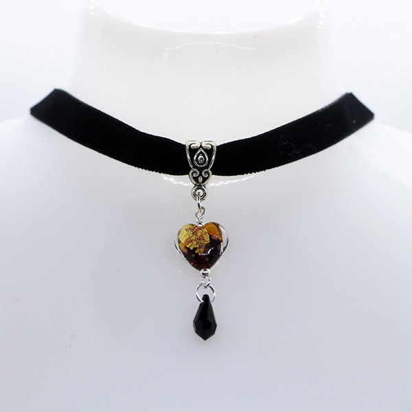 Amber Murano Glass heart with black crystal drop on black velveteen choker