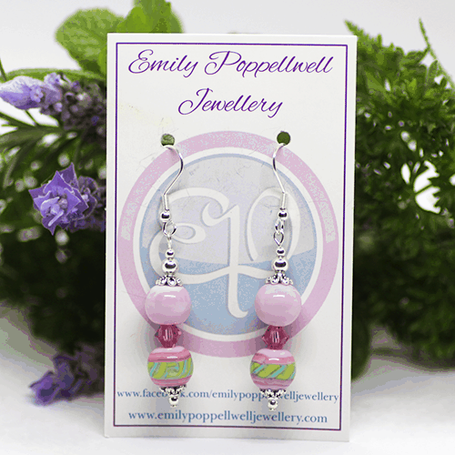 "Doubles" - Artisan Glass bead earrings - pink and green pattern, pink Swarovski crystal and pink bead doubles