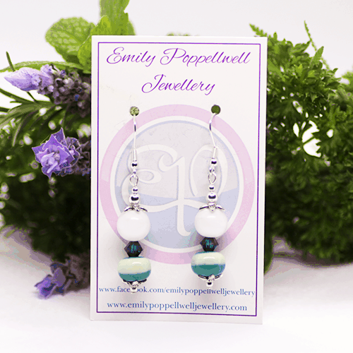 "Doubles" - Artisan Glass bead earrings - White and green pattern, dark green Swarovski crystal and white beads
