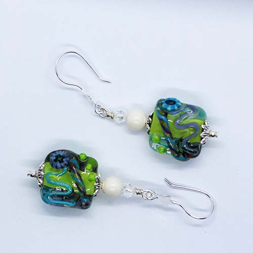 Blue, Purple & Green Artisan Glass Earrings with embedded Murrine