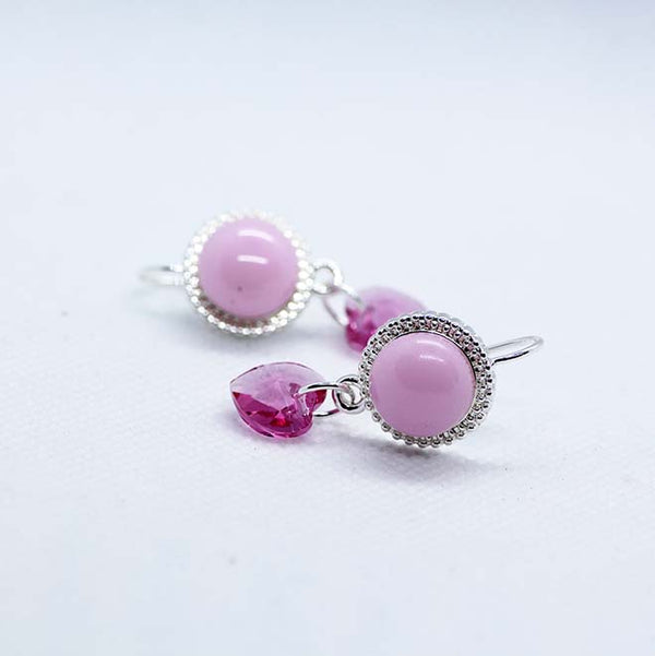 Soft pastel pink handmade artisan glass cabochon earrings with pink Swarovski heart drops