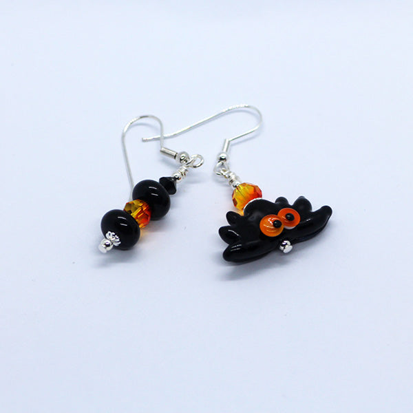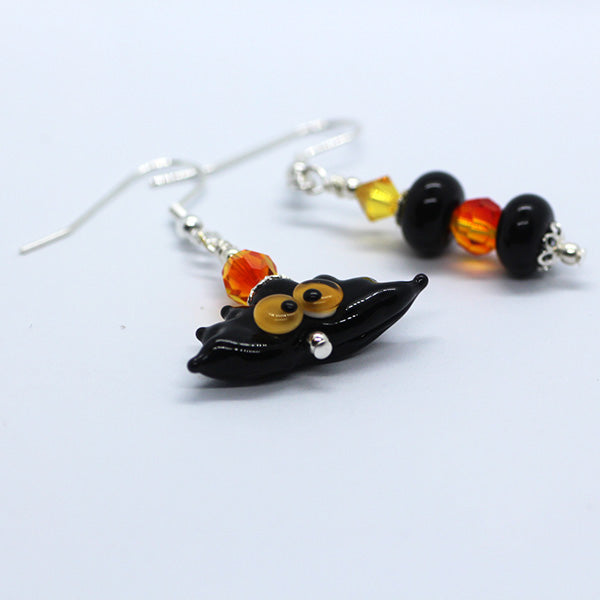 Mismatched Handmade Artisan glass earrings - single bat with yellow eyes & a matching colour double black bead & yellow/orange drop! I have matched these beads with fiery yellow/orange Swarovski crystal beads and quality silver plated components & hooks.