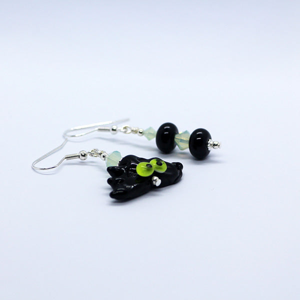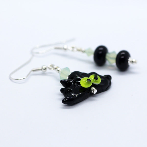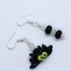 Mismatched Handmade Artisan glass earrings - single bat with lime green eyes & a matching colour double black bead & green drop! I have matched these beads with lime green Swarovski crystal beads and quality silver plated components & hooks.
