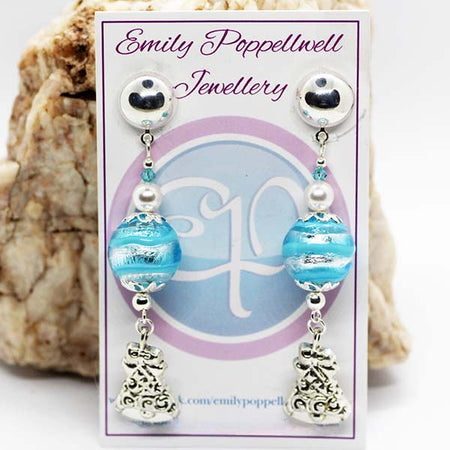 Silver Plated Blue/Green Circle Ceramic Drop Earrings with Artisan Glass Beads and Cultured Pearls