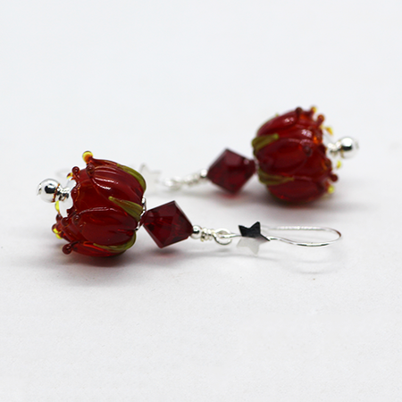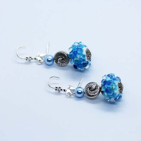 Simply Elegant Blue bubble style Artisan Glass earrings with flower accented lever back hooks