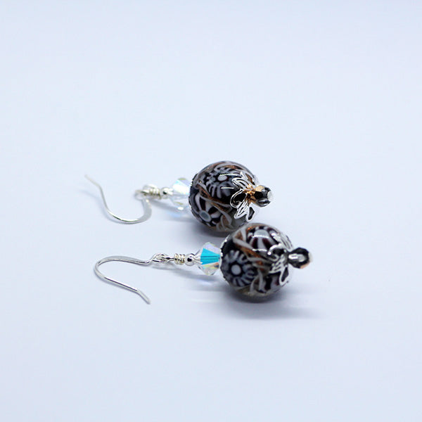 Handmade Artisan Glass Black & White with touches of Bronze Earrings with French Hooks