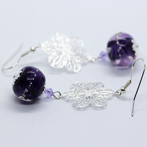 Handmade Artisan Glass Purple Earrings with Silver Plated Flower accent