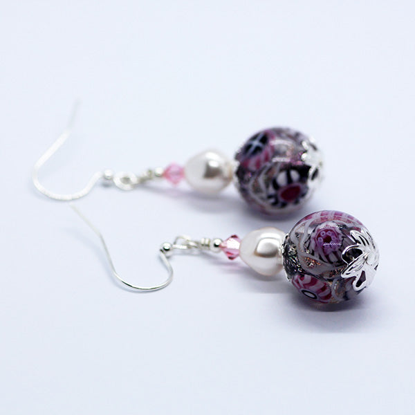 Handmade Artisan Glass pink & brown tones with natural pearl & pink crystal bead Earrings with French Hooks