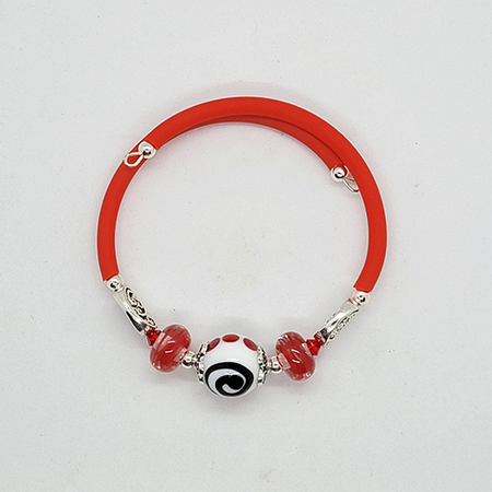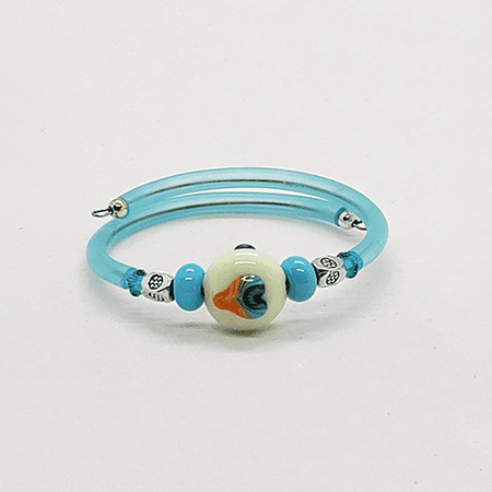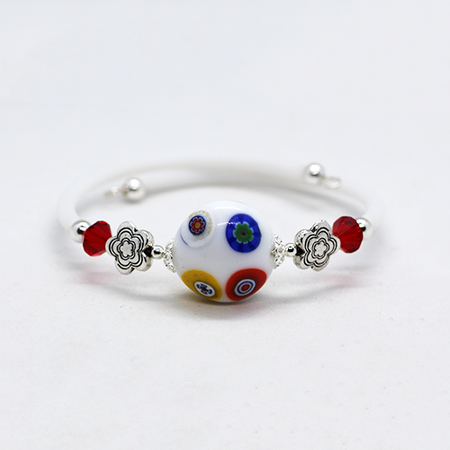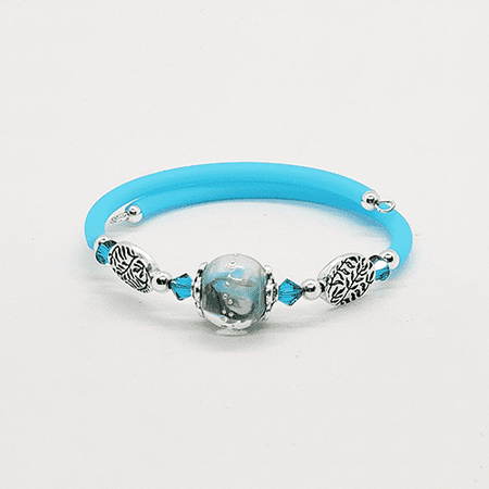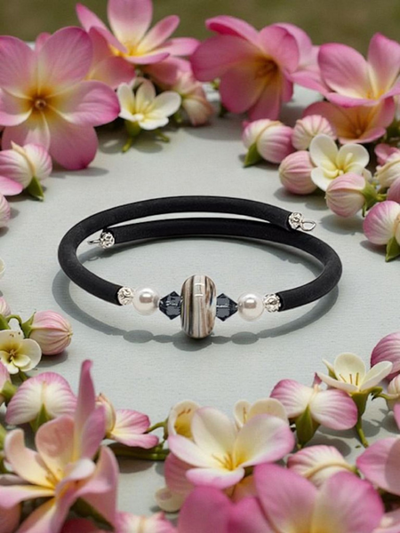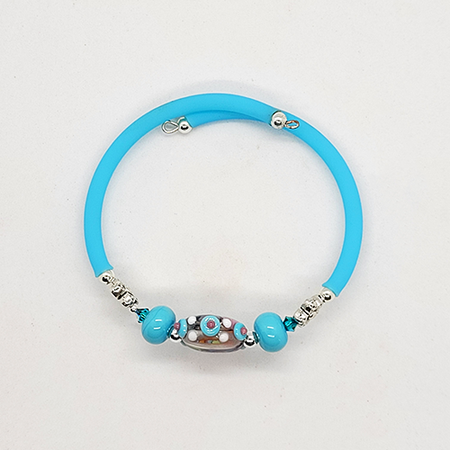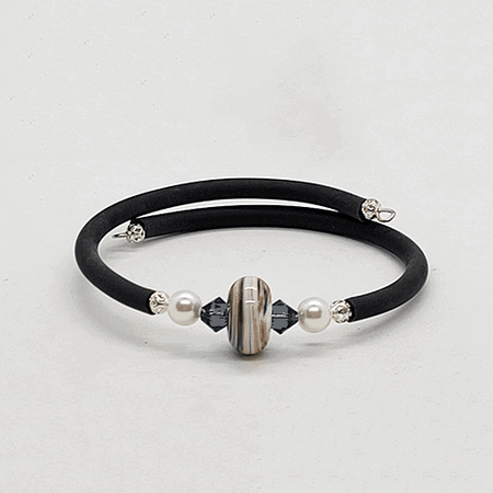 A collection of bracelets using Marano glass beads and Artisan created glass beads. Accented with silver and gold findings and Swarovski pearl and crystal beads. Memory wire bracelets are made for ease of use in placing on the wrist and are comfortable to wear with the soft silicon band.