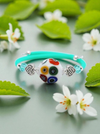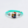 The Murano Glass white focal bead is embedded with multi coloured Murrine and is smooth to the touch.  The bracelet is accented with silver plated hearts and turquoise Swarovski Crystal beads.