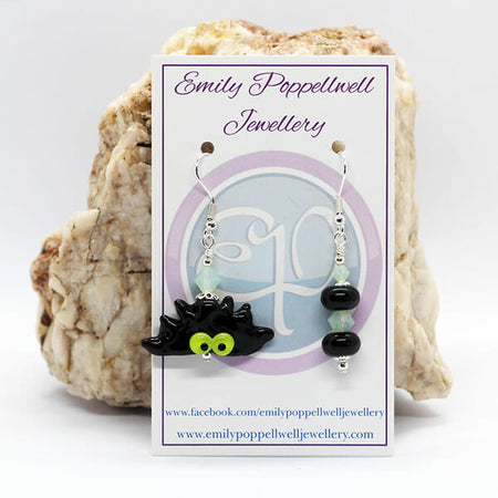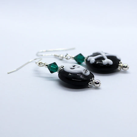 Mismatched Halloween black & white skull and cross bones, green crystals Artisan Glass earrings