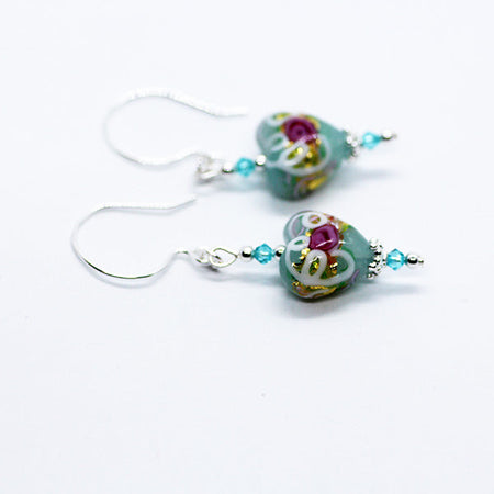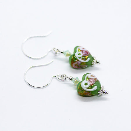 Soft Pastel Green Handmade Artisan Glass Cabochon Earrings with Light Green Crystal Heart Drops