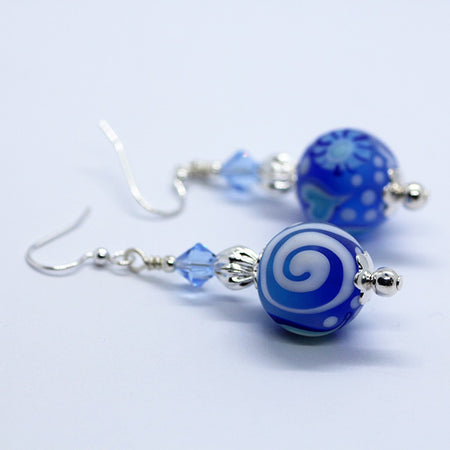 Transparent royal blue handmade artisan glass cabochon earrings with blue Swarovski heart drops