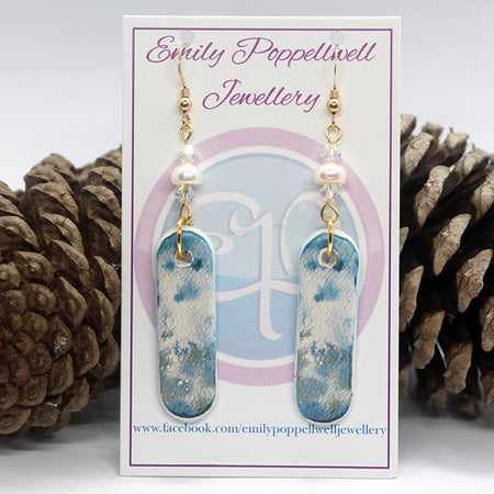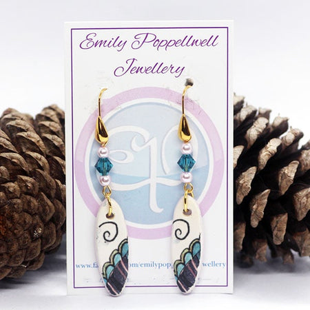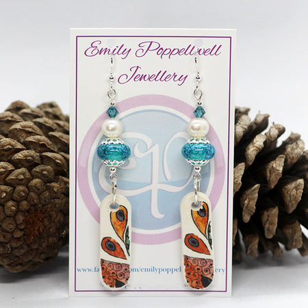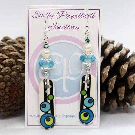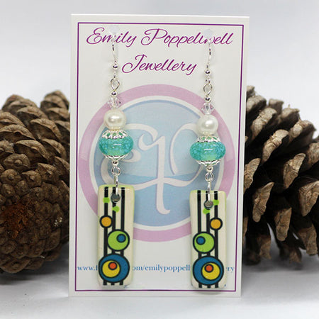 Silver Plated Blue/Green Circle Ceramic Drop Earrings with Artisan Glass Beads and Cultured Pearls