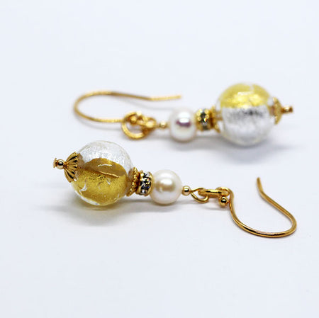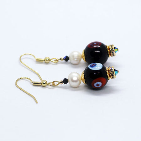 Gold Plated Black Murano Glass Earrings with White Cultured Pearls and Small Black Crystal Beads