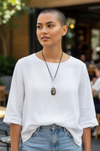 Home/Collections/Pendants/'Funky Face' Artisan Glass pendant with Swarovski clear open offset square crystal piece with blue crystal bead on satin cord