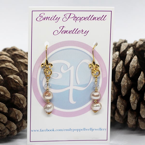 Handmade Cream /Light Pink Cultured Pearl Earrings with Fleur De Lis Design Accented Gold Plated Hooks