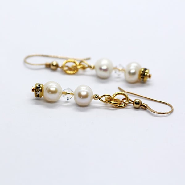 Handmade White Cultured Pearl Earrings with Clear Crystal Beads and Gold Plated Hooks