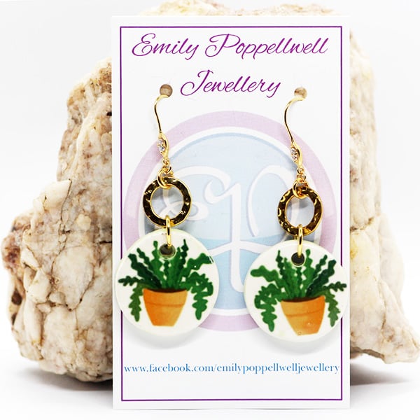 Handmade Fern in Pot Enamel Focal Earrings with Gold Plated Hammered Rounds and Gold Plated CZ accented Hooks
