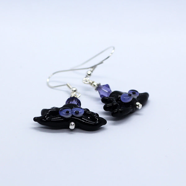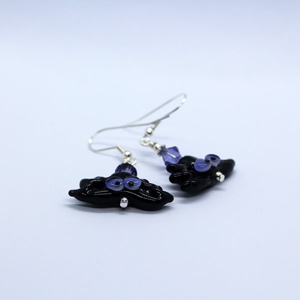 Handmade Artisan glass bats with purple eyes just hanging around! I have matched these beads with purple Swarovski crystal beads and quality silver plated components & hooks.