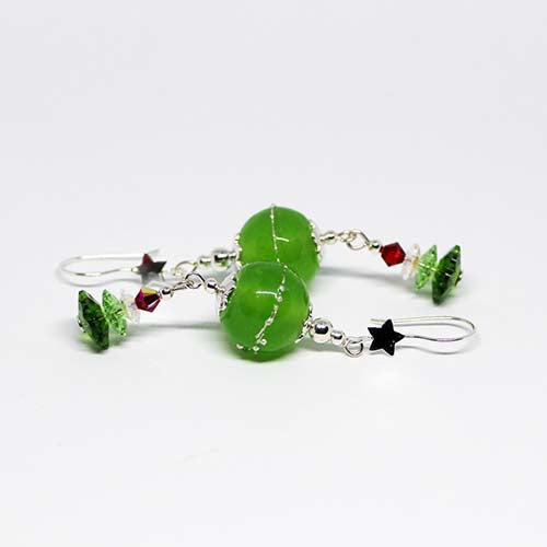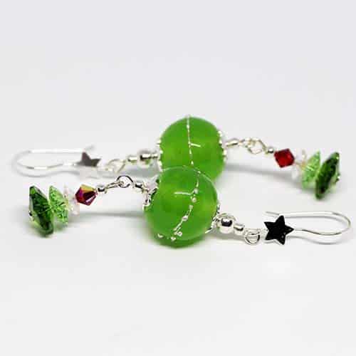 The green glass bead is teamed with a Christmas tree made from green and red Swarovski crystal beads and is accented with a silver plated star hook.