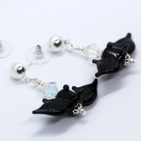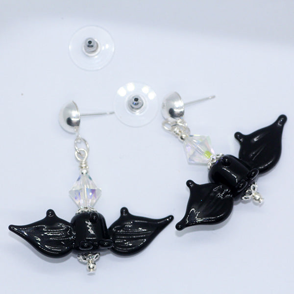 Handmade large black Artisan glass bats just hanging around upside down! I have matched these great beads with clear Swarovski crystal beads and quality silver plated components & studs.